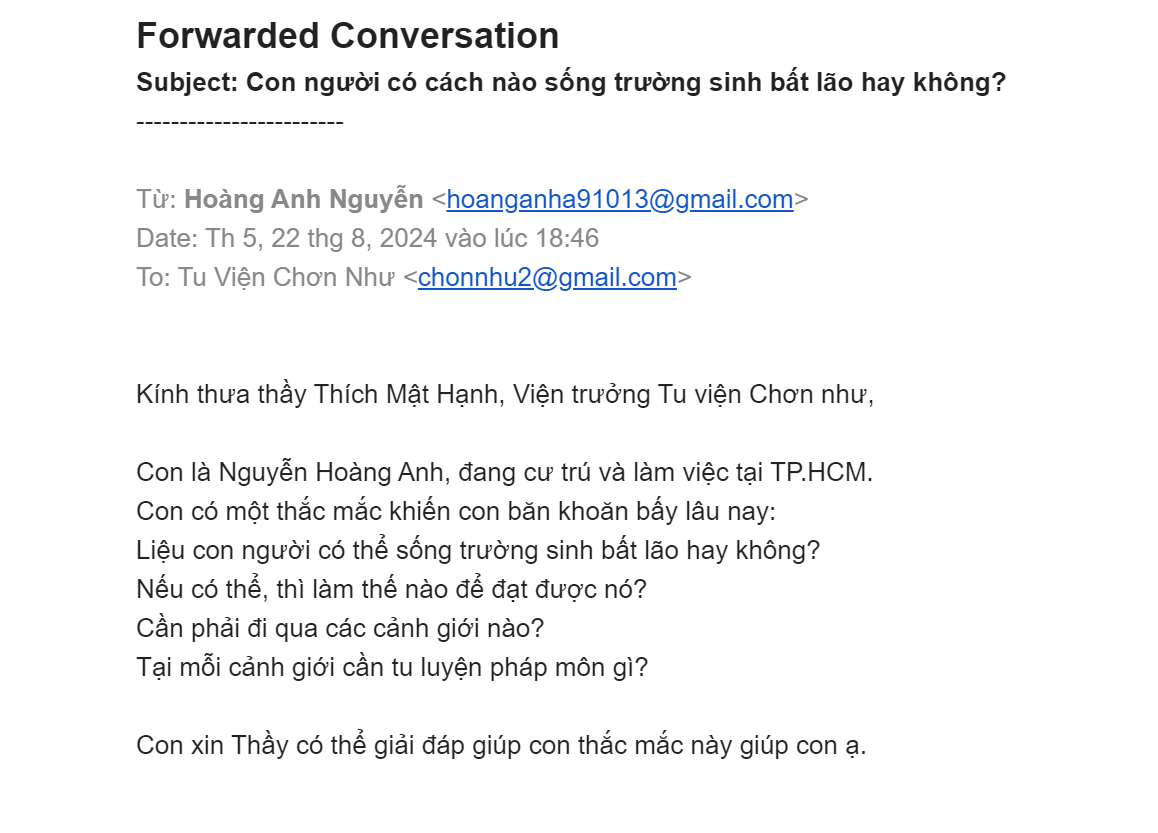 Thầy đã đọc thắc mắc của con bấy lâu, Thầy sẽ giải thích cho con và nếu con tin thực hành sẽ có lợi ích cho cuộc đời con. Nếu con không có duyên mà vẫn đi trong luân hồi lục đạo mà tìm thì cũng không bao giờ nếm được sự giải thoát con ạ. Chỉ loanh quanh trong sự hý luận nô lệ cho quy luật vô thường mà thôi.